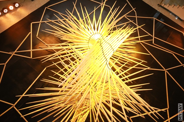 «Инсталляция с каждого ракурса выглядит по-разному: с одной стороны, виден терновый венок, с другой точки зрения – это волна деревянных копий, а если смотреть сверху, то это разлинованные поля или условность абстрактного обозначения человеческого бытия».