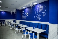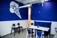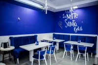 Интерьер кондитерской выполнен в итальянском стиле. В меню представлены венские вафли, авторские десерты, пицца и легкие завтраки. Главная гордость заведения - мороженое, приготовленное по итальянской технологии. На витрине представлено в ассортименте 32 вкуса таких как: Lemon Pie, Cheesecake, классическое эскимо в бельгийском шоколаде и мороженое с бельгийским печеньем Lotus.