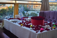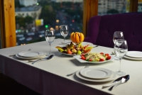 Панорамный ресторан на крыше GRAND MIR HOTEL. В меню представлены блюда европейской и национальной кухни. Падают холодные закуски, салаты, супы, горячие закуски, горячие блюда, шашлыки, десерты и напитки. Шеф повар ресторана рекомендует теплый салат с ростбифом. В заведения есть 2 зала рассчитанных на 250 человек. Интерьер выполнен в европейском стиле. Средний чек составляет 200 000 сумов. Есть доставка, парковка и wi-fi. Режим работы: 17:00 - 02:00